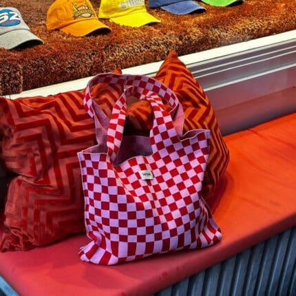 De opvallende groen-roze checkerboard print geeft een speelse touch aan deze shopper. Gemaakt van elastisch materiaal past de tas zich soepel aan aan de inhoud, terwijl het duurzame ontwerp zorgt voor langdurig gebruik.