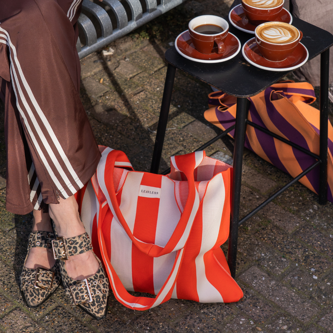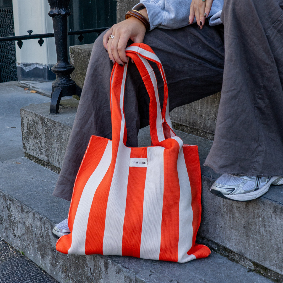 De opvallende oranje-wit gestreepte print geeft een speelse touch aan deze shopper. Gemaakt van stevig materiaal de tas past zich soepel aan aan de inhoud, terwijl het duurzame ontwerp zorgt voor langdurig gebruik.